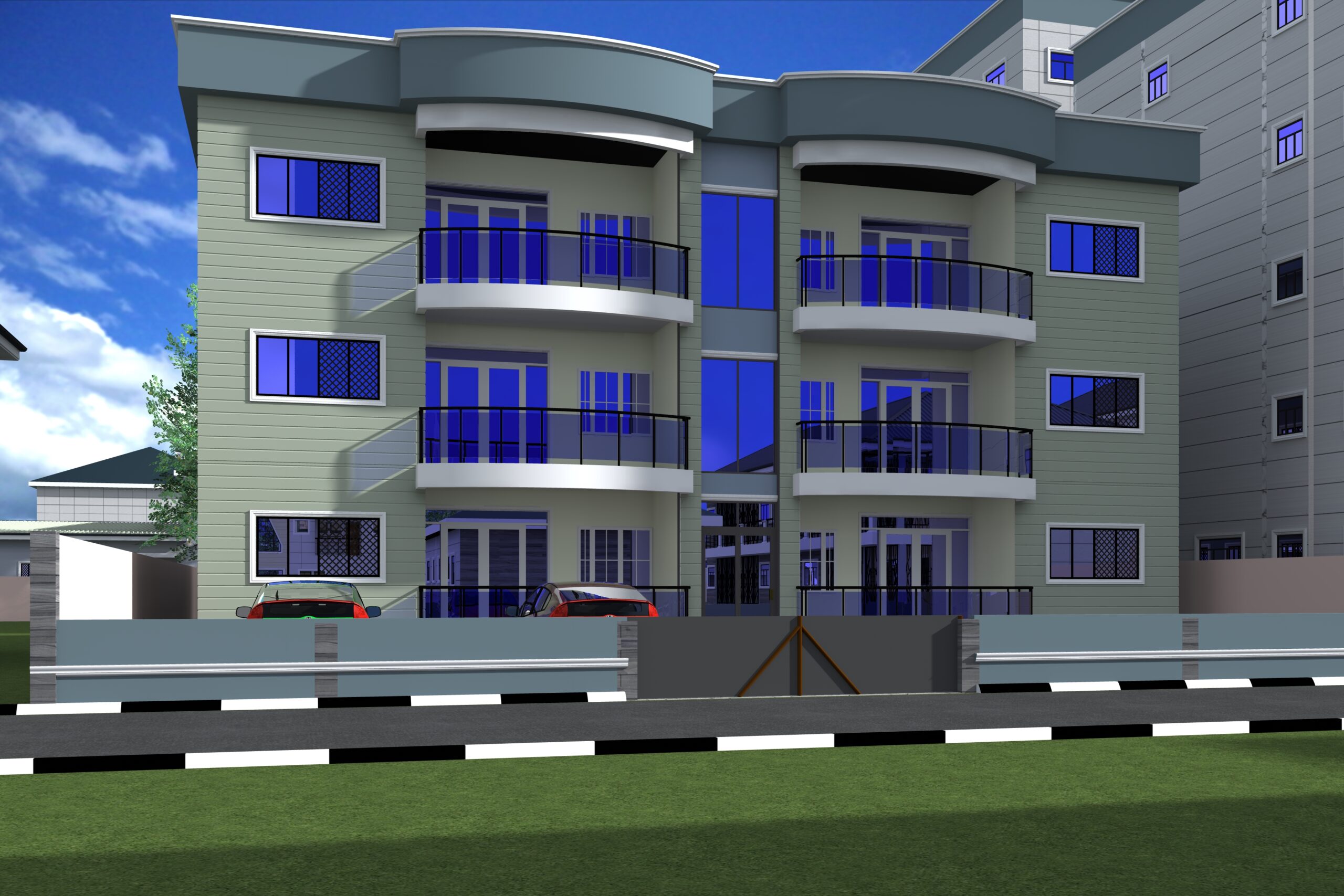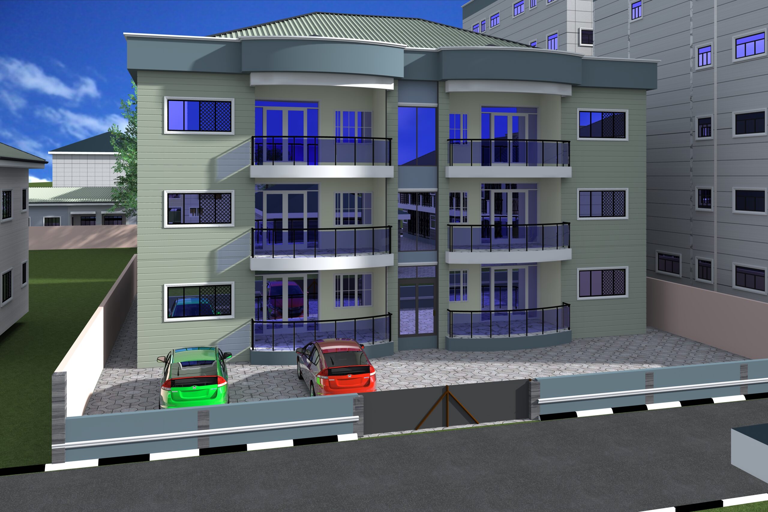 The ground floor features a comfortable 3-bedroom owner's apartment (living room, kitchen, dining area, 2 toilets) with a separate, modern studio apartment (parlor, bedroom, kitchen, toilet) for rental income. A fence ensures privacy between the owner's space and the rental unit. The first and second floors each mirror the rental unit layout with four identical, modern studios, each with its own private facilities. This design provides excellent rental potential while offering the owner comfortable private living. We can create a unique building plan to fit your vision and budget.